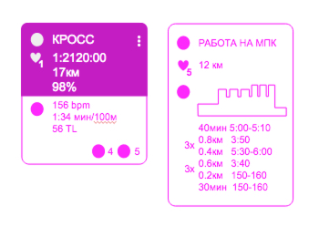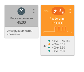 Мы искали вариант карточки, которая позволит спортсмену и тренеру при беглом взгляде на выбранный день увидеть основные параметры планового задания или выполненной тренировки, при этом не перегрузив календарь лишней информацией.