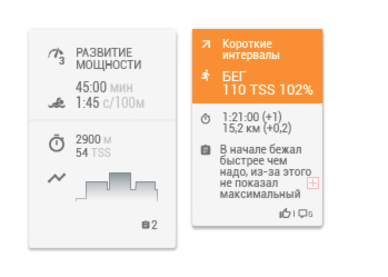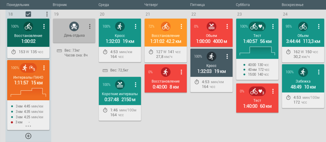 Есть три элемента календаря, дополняющие друг друга и помогающие спортсмену и тренеру оценить недельный объем тренировок, их статус, а также параметры отдельной тренировки. Это карточка отдельного задания, календарная сетка, в которой они отображаются, и итоги недели.